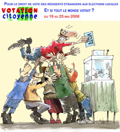 Les élections municipales ayant eu lieu en mars 2008, nous souhaitons que les collectifs et les organisations des différentes villes puissent interpeller les élus, afin qu’ils se prononcent sur le droit de vote et d’éligibilité des résidents étrangers. L’objectif serait d’inciter les élus à prendre position, et de faire en sorte que leurs nouveaux conseils municipaux émettent des vœux sur cette même question. Il faut rappeler que le Sénat a toujours un rôle important. Or dans quelques mois vont avoir lieu des élections sénatoriales et la position des nouveaux élus locaux de mars 2008 doit pouvoir compter pour faire évoluer le rapport de force.