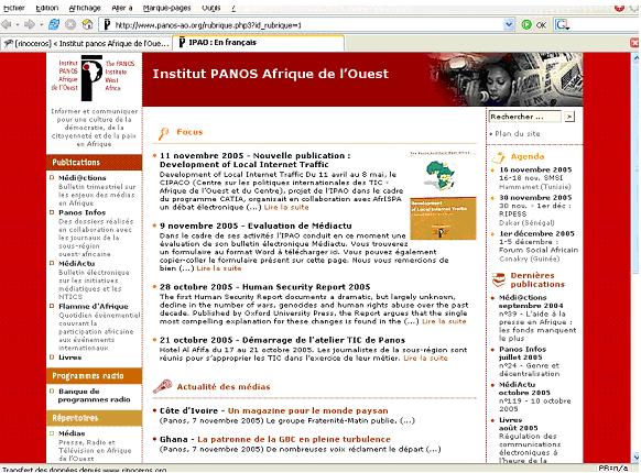 Le site de l’IPAO propose un bulletin trimestriel sur les enjeux des médias en Afrique, des articles, des émissions de radio, des dossiers réalisés en collaboration avec les journaux de la sous-région ouest-africaine, un bulletin électronique sur les initiatives médiatiques et les nouvelles technologies de l’information et de la communication ainsi qu’un quotidien évènementiel couvrant la participation africaine aux événements internationaux et une banque de programmes radio. Il donne également accès à différents répertoires (des médias en Afrique de l’Ouest, des organisations professionnelles liées aux médias et des législations, lois et règlements sur les médias). Enfin, le site propose des dossiers sur les thématiques suivantes : Pluralisme de l’information, Diversité, Société civile et bonne gouvernance, NTIC, Radio, Presse écrite.