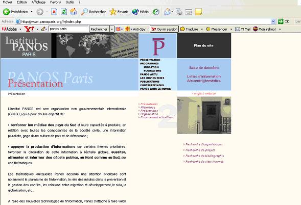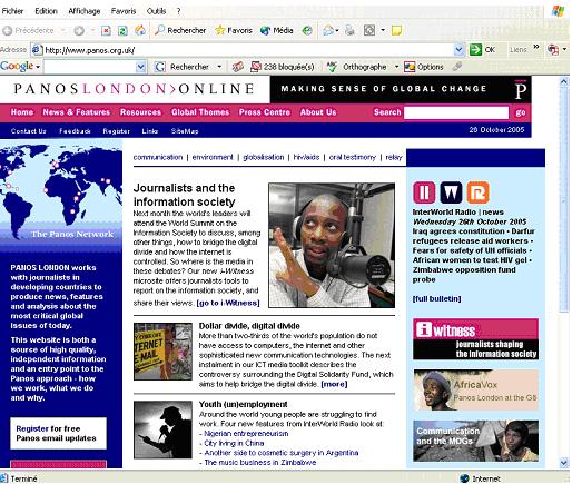 L’Institut Panos, créé en 1986, a pour objectif de stimuler le débat sur l’environnement mondial et les problèmes de développement en fournissant la matière première de réflexions propres. Structure décentralisée formée d’offices autonomes à Londres, Paris, Washington, Kathmandu, Kampala, Addis, Haiti, Dakar, Panos travaille avec les médias et autres moyens de communication afin de permettre aux pays en voie de développement de créer et promouvoir leur propre programme de développement à travers le débat public. Panos travaille particulièrement à amplifier la voix des pauvres et des populations marginalisées, ainsi qu’à favoriser le pluralisme médiatique.