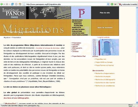 Le programme Mime est une initiative de l’association Panos Paris. Le site du programme Mime (Migrations internationales & media) se conçoit comme un centre de ressources pour les acteurs impliqués ou intéressés par la participation des personnes issues de l’immigration au développement de leurs sociétés d’accueil et d’origine. Par des études et des publications téléchargeables, par des données sur les associations issues de l’immigration et leurs projets, par une série de liens et des bibliographies thématiques, il s’agit de fournir à chacun des outils et des matériaux de réflexion.