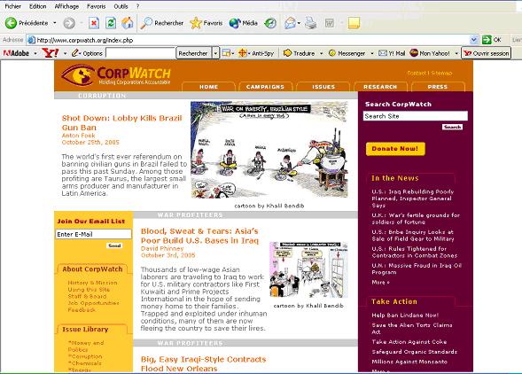 The CorpWatch website has an extensive Issues Library which holds articles classed under different themes. There is also a Research Guide and details of current campaigns, including ‘War Profiteers’, and a weekly radio show/podcast.