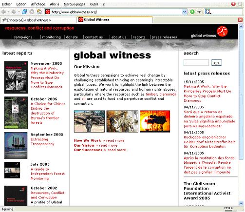 L’ONG britannique Global Witness, créée en 1993, mène des campagnes contre les violations des droits humains dans le processus d’exploitation des ressources naturelles, notamment quand l’exploitation du bois, des diamants et du pétrole perpétue des situations de conflits.