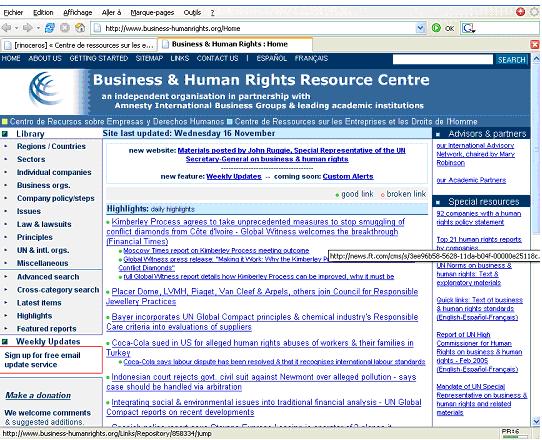 La bibliothèque en ligne du Centre de Ressources sur les Entreprises & les Droits de l’Homme couvre plus de 2000 entreprises, 160 pays et 150 thèmes. Le site est composé de liens vers un large éventail de matériel publié par des entreprises, des organisations non gouvernementales, des gouvernements, des organisations intergouvernementales, des journalistes, des universitaires, etc. Il inclut des rapports de mauvaise conduite ainsi que des exemples positifs de « meilleures pratiques » par les entreprises.