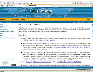 OECD Watch est un réseau international d’ONG oeuvrant depuis 2003 pour la responsabilité des entreprises. L’objectif d’OECD Watch est d’informer la communauté des ONG sur les politiques et les activités du Comité de l’investissement de l’OCDE et d’évaluer l’efficacité des Principes directeurs de l’OCDE à l’intention des entreprises multinationales.