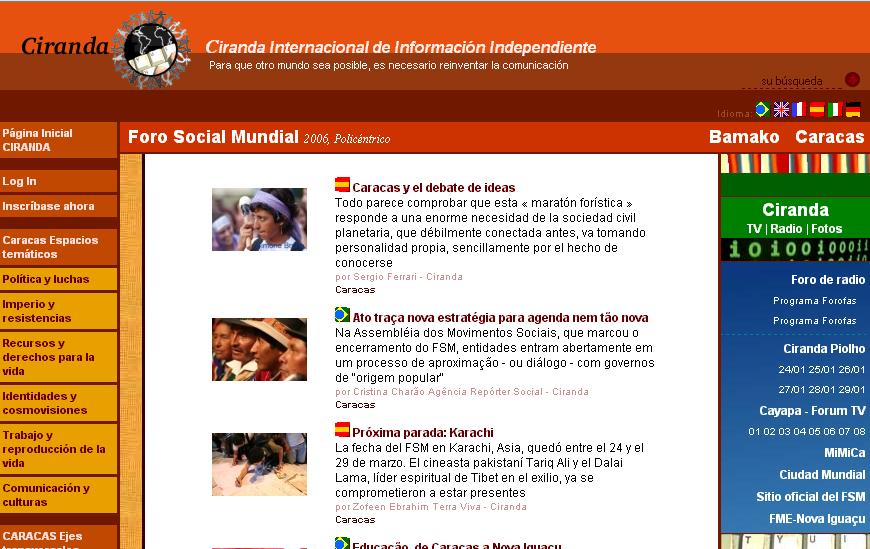 El sitio propone articulos, audios, videos y fotos sobre FSM y otras manifestaciones.