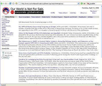 Its website proposes documents and news related to Hong Kong, Agriculture, GATS, Investments, NAMA, TRIPS, Regional Trades, War & Terrorism, and WTO.
