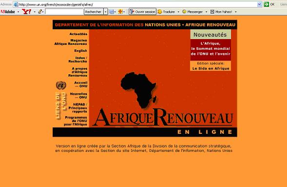 La section Afrique du Département de l’information de l’ONU a pour mission de diffuser en temps voulu des informations et des analyses fiables portant sur les questions économiques et les problèmes de développement que connaît le continent africain. Lancée en 1987, Afrique Renouveau (anciennement Afrique Relance) est la principale publication de cette section, qui produit également des documents d’information approfondis, des dossiers et d’autres communiqués.
