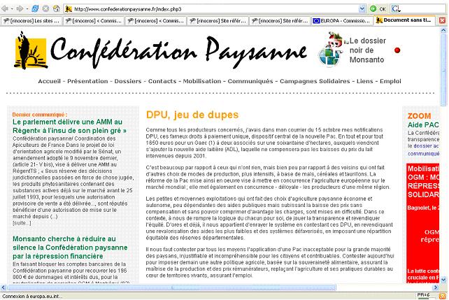 Le site de la confédération paysanne propose des dossiers sur les pesticides, les OGM, le foncier, l’OMC, les politiques agricoles, les questions internationales (OMC, souveraineté alimentaire) ou encore les sémences.