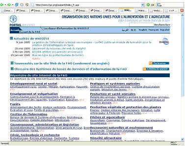 WAICENT est le site portail de la FAO. Il donne accès aux bases de données statistiques de la FAO, aux systèmes d’information et de cartographie sur la sécurité alimentaire et la vulnérabilité, aux profils pays de la FAO ainsi qu’aux archives de documents de l’organisation.