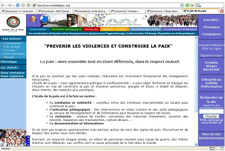 Le site de l’Ecole de la paix propose des dossiers thématiques (par exemple sur l’ONU, l’analyse de conflits, la conversion des industries d’armement ou encore la situation des minorités).
