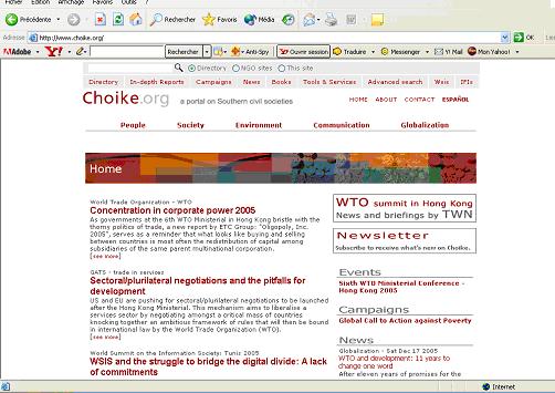 Choike, a project of the Third World Institute is a portal dedicated to improving the visibility of the work done by NGOs and social movements from the South. The website holds a vast NGO directory, searchable by issue, a selection of materials produced by these NGOs and a number of in-depth reports/dossiers on key issues.