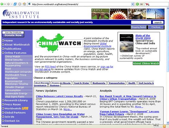 A joint initiative of the Worldwatch Institute and Beijing-based Global Environmental Institute (GEI), China Watch reports on energy, agriculture, population, water, health, and the environment in China—with an emphasis on news and big-picture analysis relevant to policy makers, the business community, and non-governmental organizations.