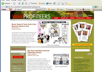 The War Profiteers website is maintained and updated by CorpWatch, an organization that counters corporate-led globalization through education, network-building and activism. It highlights those organisations that have benefited from preferential contracts in Iraq since the war and the Occupation.