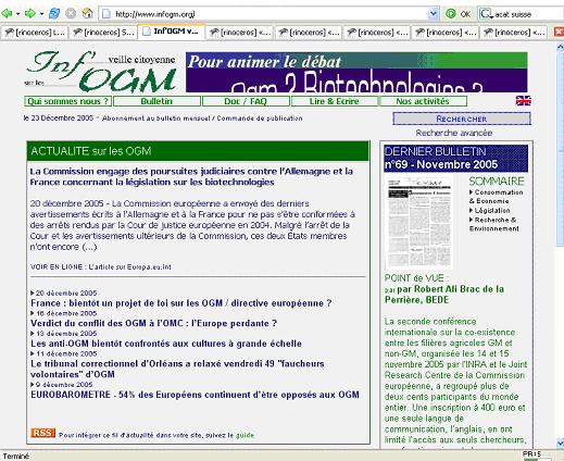 Inf’OGM a pour but d’élaborer et de diffuser une information régulière, vérifiée, concise et référencée, sur tous les enjeux des OGM, et cela dans un langage compréhensible par tous. Inf’OGM propose également un bulletin mensuel disponible par abonnement (15€/an). Les archives du bulletin depuis sa création en 1999 jusqu’au dernier numéro paru sont disponibles en ligne.