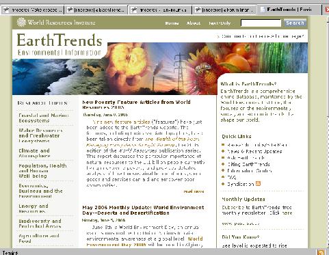 EarthTrends was created in 2000 by the environmental think tank WRI (World Resources Institute). It is an online collection of information regarding the environmental, social, and economic trends that shape our world, and provides databases including maps, datatable and directories on topics such as: Coastal & Marine Ecosystems; Water Resources & Freshwater Ecosystems; Climate & Atmosphere; Population, Health & Human Well-being; Economics, Business & the Environment; Energy & Resources; Biodiversity & Protected Areas; Agriculture & Food; Forests, Grasslands, & Drylands; Environmental Governance & Institutions.