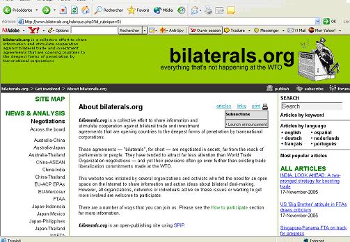 The site contains news and analyse relating to a huge range of trade negotiations in progress between States and/or supra-nation groups; information on the situation of deals and agreements; and sections devoted to the key issues surrounding these trade moves, such as labour, corporate interests, agriculture. Articles are also available in French and Spanish.