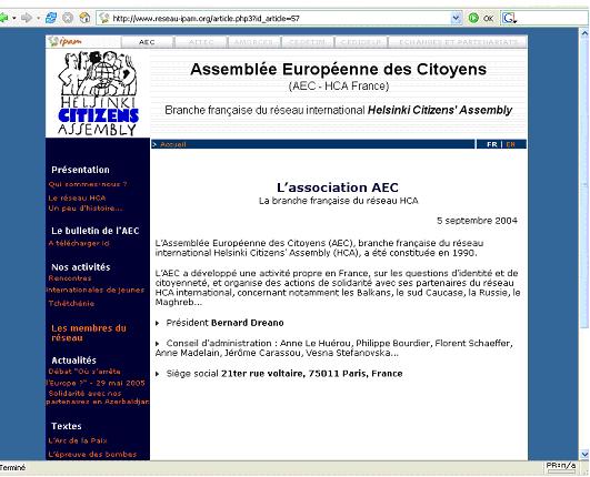 L’Assemblée Européenne des Citoyens (AEC) est la branche française du réseau international Helsinki Citizens’ Assembly (HCA). Elle a développé une activité propre en France, sur les questions d’identité et de citoyenneté, et organisé des actions de solidarité avec ses partenaires d’HCA-international, concernant notamment les Balkans, le sud Caucase, la Russie, le Maghreb...