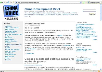China Development Brief is an independent publication established in 1996 to report on social development in China, with particular emphasis the work of international and Chinese NGOs. Its core service consists of news and feature stories in English, a newsletter and a bimonthly Chinese language magazine.