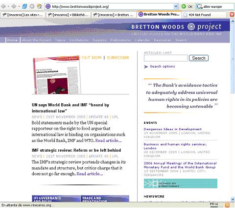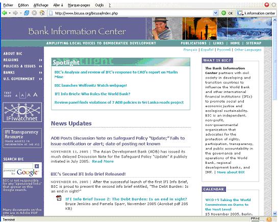 The contents of the site can be viewed by topic, institution or region. Each of these sections then contains articles, newsletters and reports which pertain to this theme, as well as a list of organisations which focus on these issues. The is also a database of films on the World Bank, International Monetary Fund (IMF) and Regional Development Banks, as well as a calendar of international events.