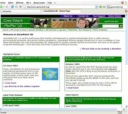 The website provides information regarding GM Crops & Food; Human Genetics; GM Animals; Lab Use; Patenting; and Bio-Weapons.