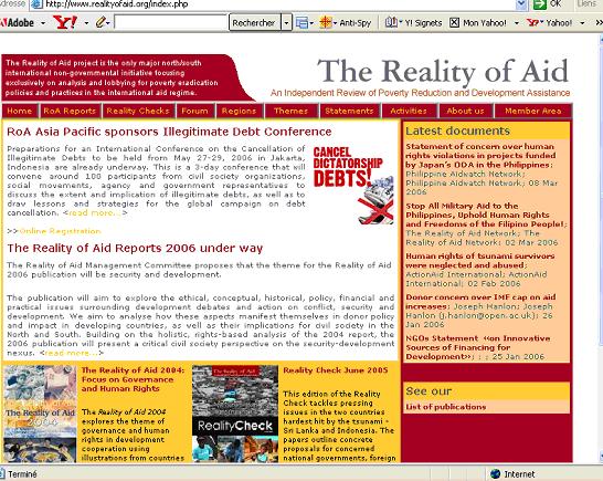 The Reality of Aid project is a major north/south international non-governmental initiative focusing exclusively on analysis and lobbying for poverty eradication policies and practices in the international aid regime. It brings together more than 40 civil society networks working in the field of international cooperation in the 22 donor countries, in Asia, the Americas and Africa. The project builds on a ten-year track record of independent assessment of aid policies and practices, accompanied by constructive dialogue with policy makers at national and international levels. The Reality of Aidproject aims to contribute to more effective international aid and development cooperation strategies to eliminate poverty, based on principles of North/South solidarity and equity.
