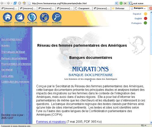 Conçue par le Secrétariat du Réseau des femmes parlementaires des Amériques, une banque documentaire présente les principales études et analyses traitant des impacts des migrations sur les femmes dans le contexte de l’intégration des Amériques, mais aussi dans d’autres régions. Elle a pour but d’informer les parlementaires de même que les chercheurs et les étudiants qui s’intéressent à ces questions. La banque documentaire regroupe des textes classés par thèmes ainsi qu’une liste de sites internet pertinents. Un second site présente les principales études et analyses portant sur les impacts de la libéralisation commerciale sur les femmes, en accordant une attention particulière à la Zone de libre-échange des Amériques (ZLEA)