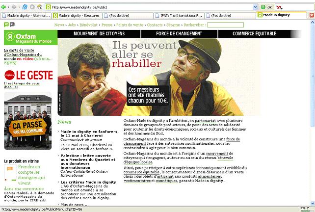 Le site Made in dignity publie en ligne les actualités, analyses et études d’Oxfam-Magasins du monde. Les thèmes sont les suivants : vêtements, artisanat, coton, matières premières et altermondialisme.