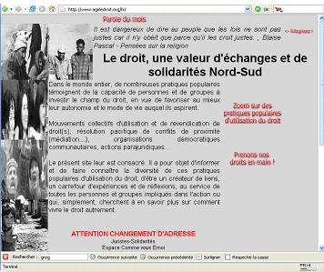 Animé par l’association Juristes Solidarités, le présent site est consacré aux nombreuses pratiques populaires témoignent de la capacité de personnes et de groupes à investir le champ du droit, en vue de favoriser au mieux leur autonomie et le mode de vie auquel ils aspirent. Il a pour objet d’informer et de faire connaître la diversité de ces pratiques populaires d’utilisation du droit, d’être un créateur de liens, un carrefour d’expériences et de réflexions, au service de toutes les personnes et groupes impliqués dans l’action ou qui, simplement, cherchent à en savoir plus sur comment vivre le droit autrement.